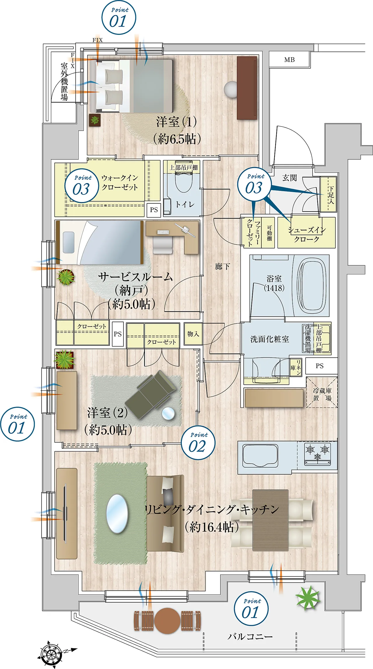 陽当たり・通風に優れた東南角住戸で、前面に遮る建物がない抜け感のある眺望が魅力。可変式間仕切りを活用すると、LDKは約21帖超の大空間となり、家族構成やライフスタイルに応じた柔軟な使い方が可能です。
