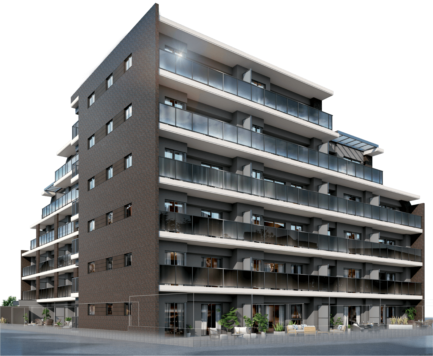 黒褐色のレンガ調タイルに白い水平ライン、黒系のガラス手摺を採用。