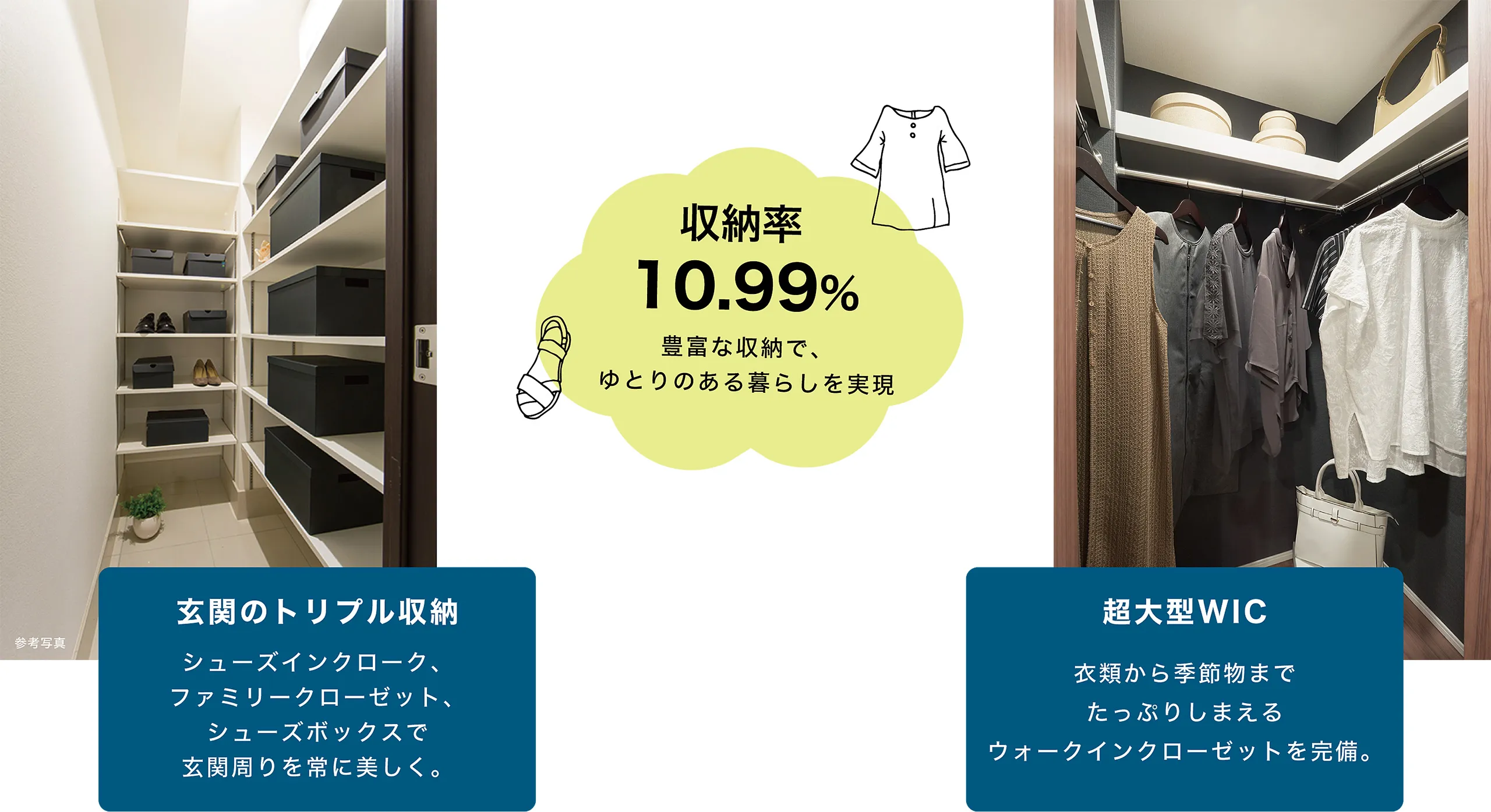 「収納率10.99%」という数字が示す通り、この住まいには生活を美しく整えるための工夫が満載です。