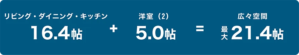 LDKは、洋室(2)の扉を開け放つことで、約21帖超の一体感ある大空間に。