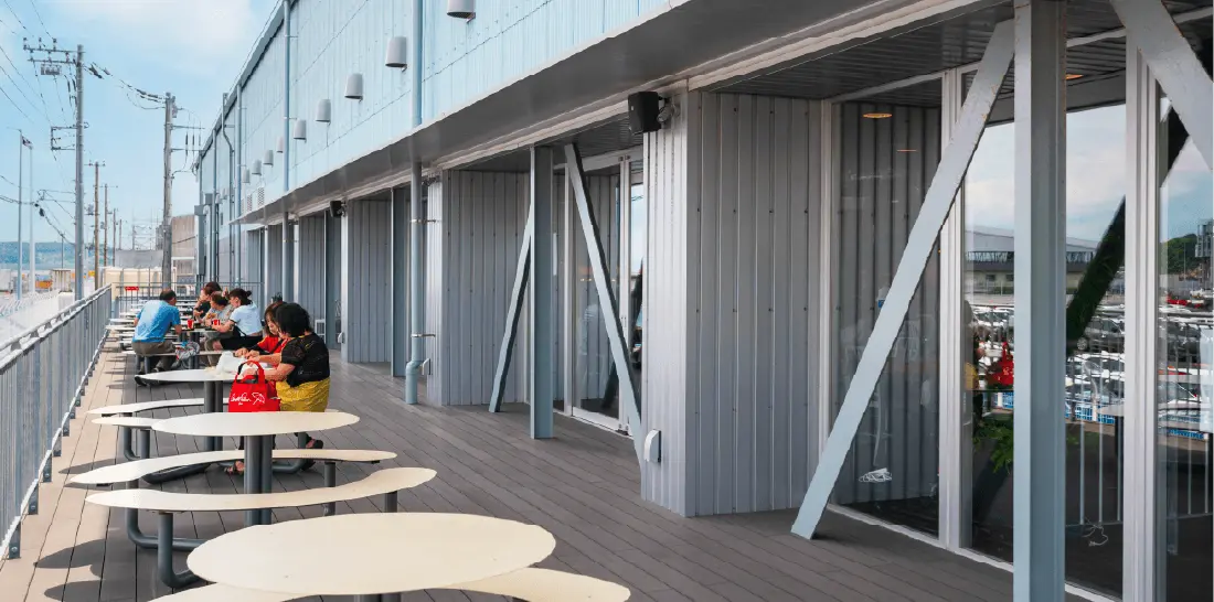 横須賀や三浦半島の豊かな作物を、様々なジャンルの飲食店が調理。 オーシャンビューが印象的なウッドデッキで、いつでも誰でもお食事を楽しんでいただけます。