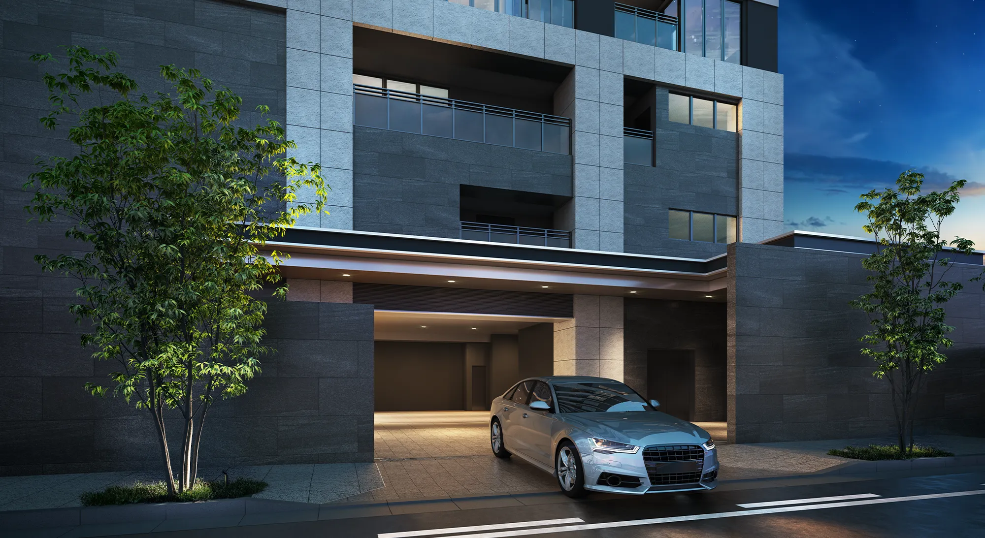あたたかな光を灯す、端正な設えのカーエントランス。