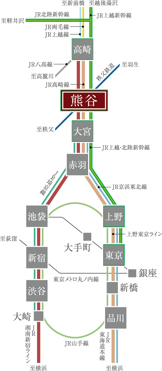JR「熊谷」駅は、JR高崎線・湘南新宿ラインと上越・北陸新幹線が利用可能な県内有数のターミナル駅。JR高崎線からJR上野東京ライン乗入れ利用によって「東京」駅へ直通75分、「品川」駅へ82分で直通します。JR湘南新宿ライン快速利用で「新宿」駅へ74分でダイレクトアクセス。さらに、上越・北陸新幹線を利用すれば「東京」駅へ直通37分と、都心へのフットワークは軽快です。