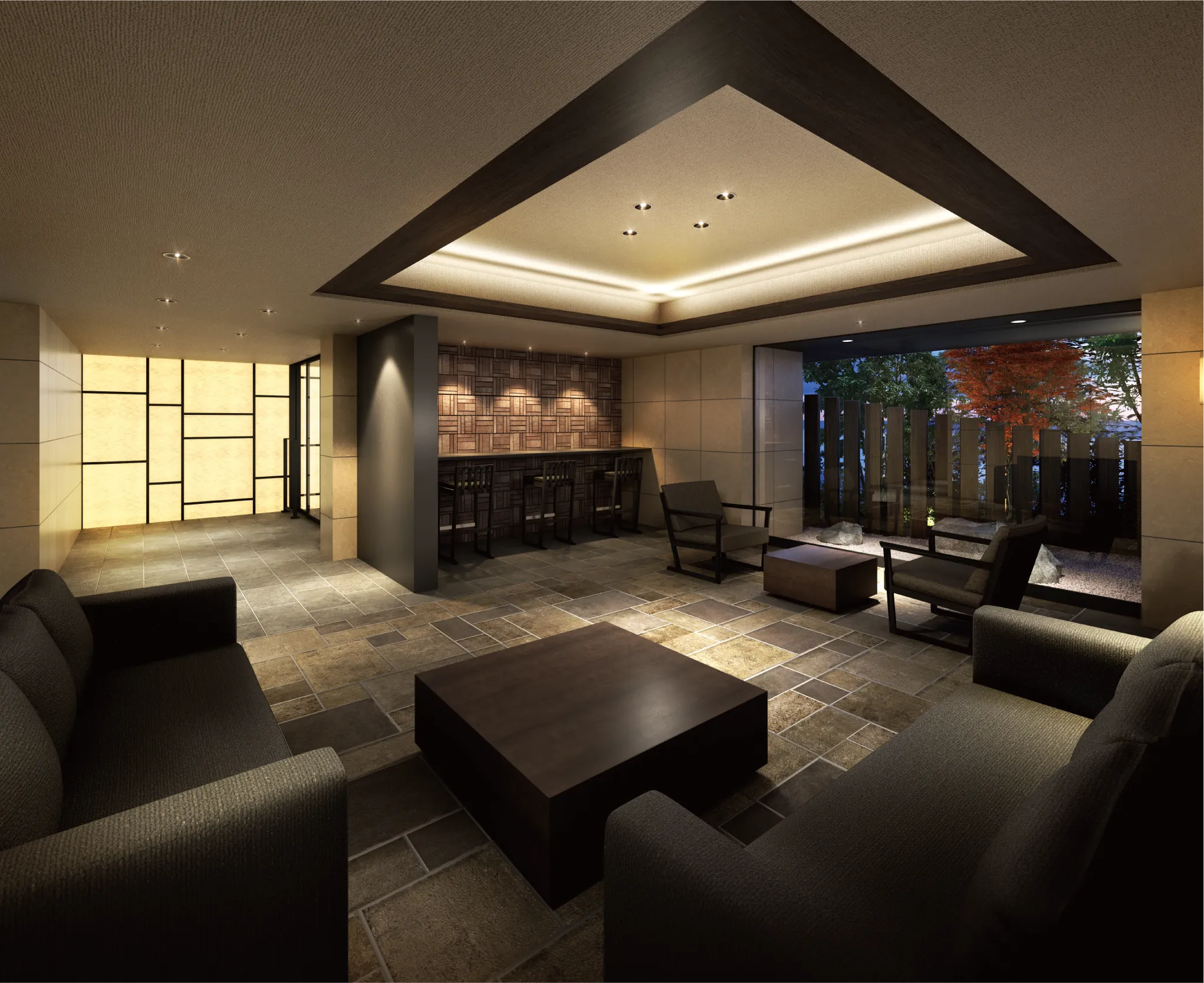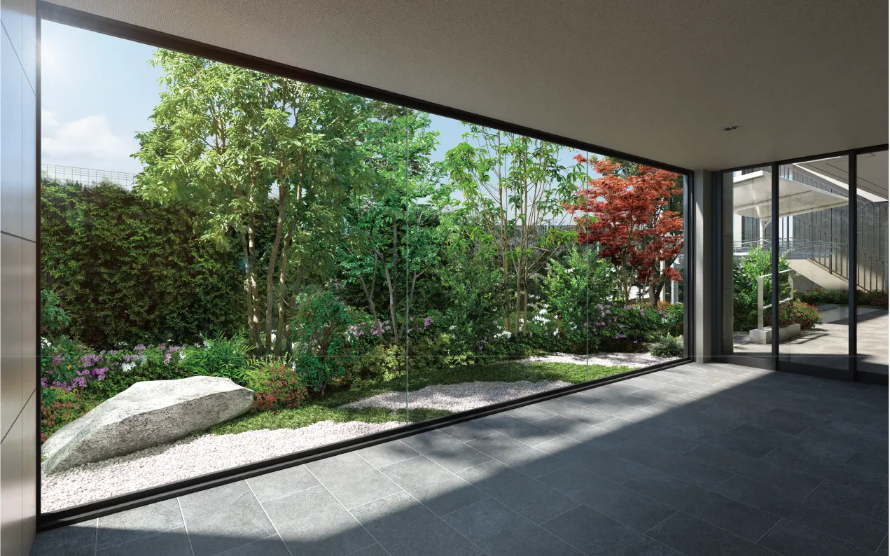 - ※掲載のラウンジ完成予想CG・エレベーターホール完成予想CGは計画段階の図面を基に描き起こしたもので実際とは多少異なります。また、家具・調度品等の形状・色等は今後変更される場合がありますので、あらかじめご了承ください。ラウンジのご利用にあたっては、管理規約に準じていただきます。なお、植栽は特定の季節の状況を示すものではありません。また、敷地内の植栽の樹種、大きさについては未確定となっており、竣工時には、完成予想CG程度には成長しておりません。