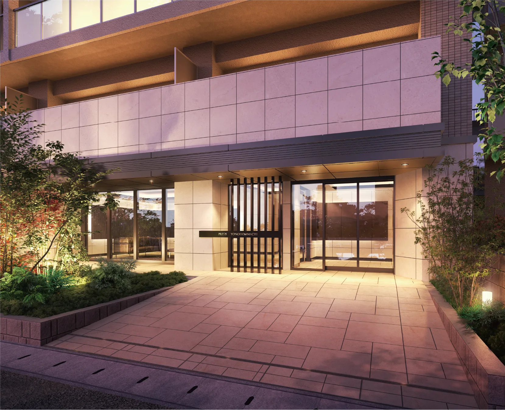 豊かな植栽と石貼りのアプローチとともに住まう人、訪れる人を迎えます。