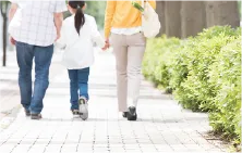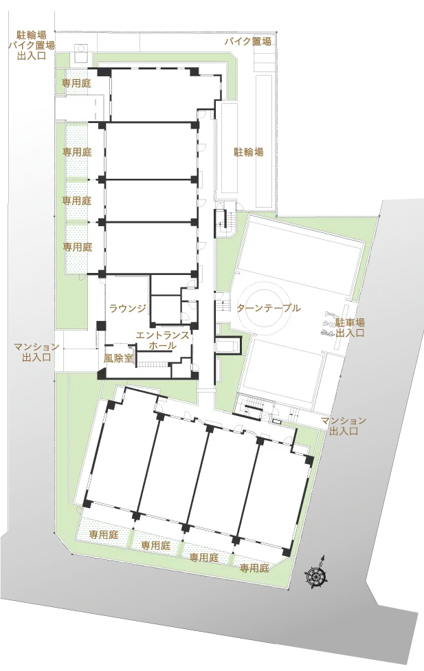 歩行者と自動車・自転車の動線を分けた歩車分離設計。