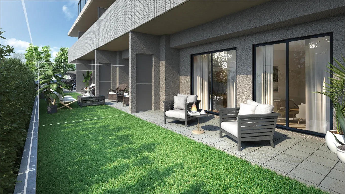 1階住戸には、タイル貼りのテラスと芝生のプライベートガーデン(専用庭)を確保。ガーデニングを楽しんだり、チェアを置いて寛いだり。土の薫りを身近に楽しめる住まいです。