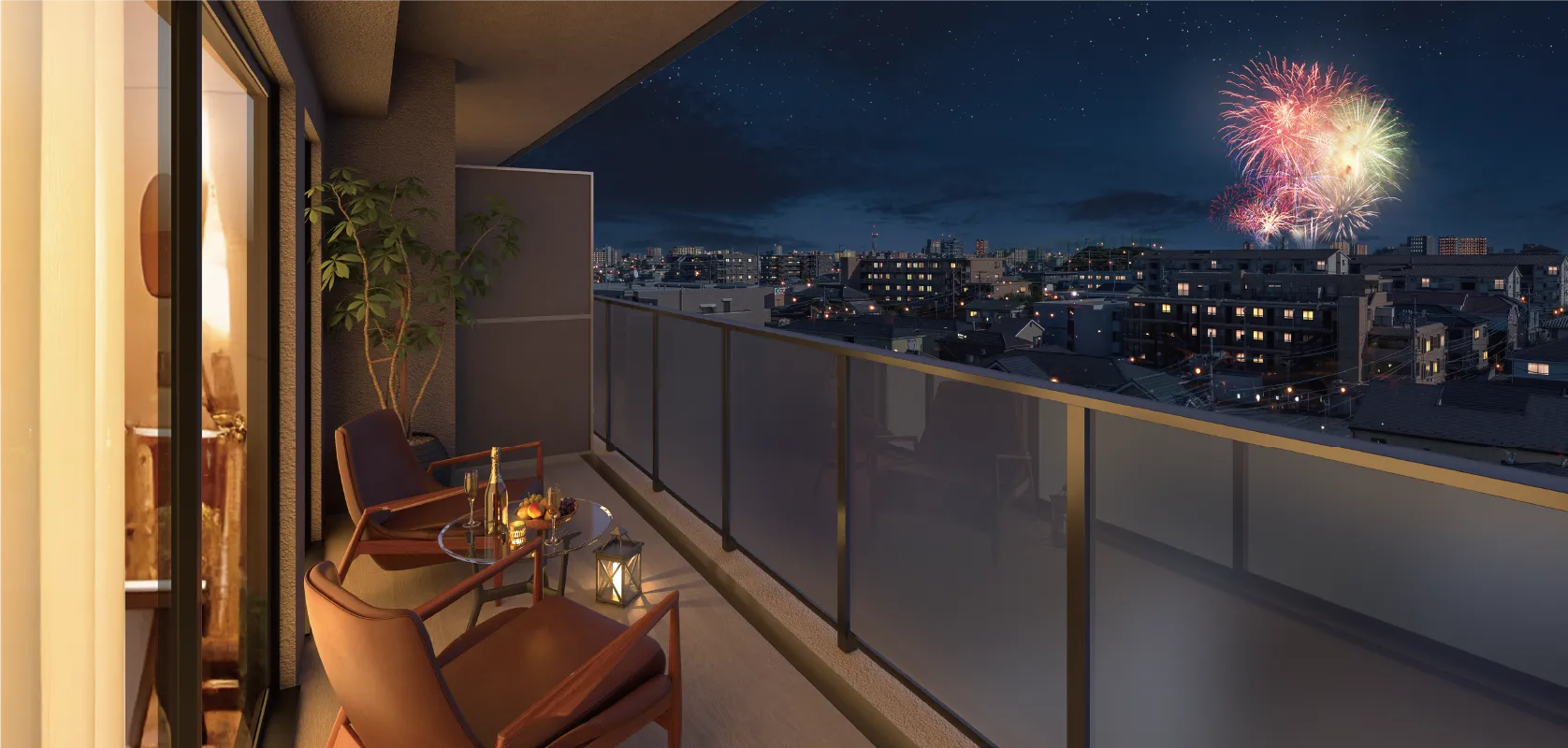 全邸とも間口いっぱいに広がるワイドなバルコニー。南向き住戸の上層階では、例年、同時開催で荒川の両岸を彩る「いたばし花火大会・戸田橋花火大会」の観覧も期待できます。