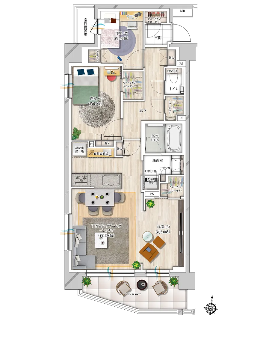 WIC:ウォークインクローゼット、SIC:シューズインクローゼット、FC:ファミリークローゼット