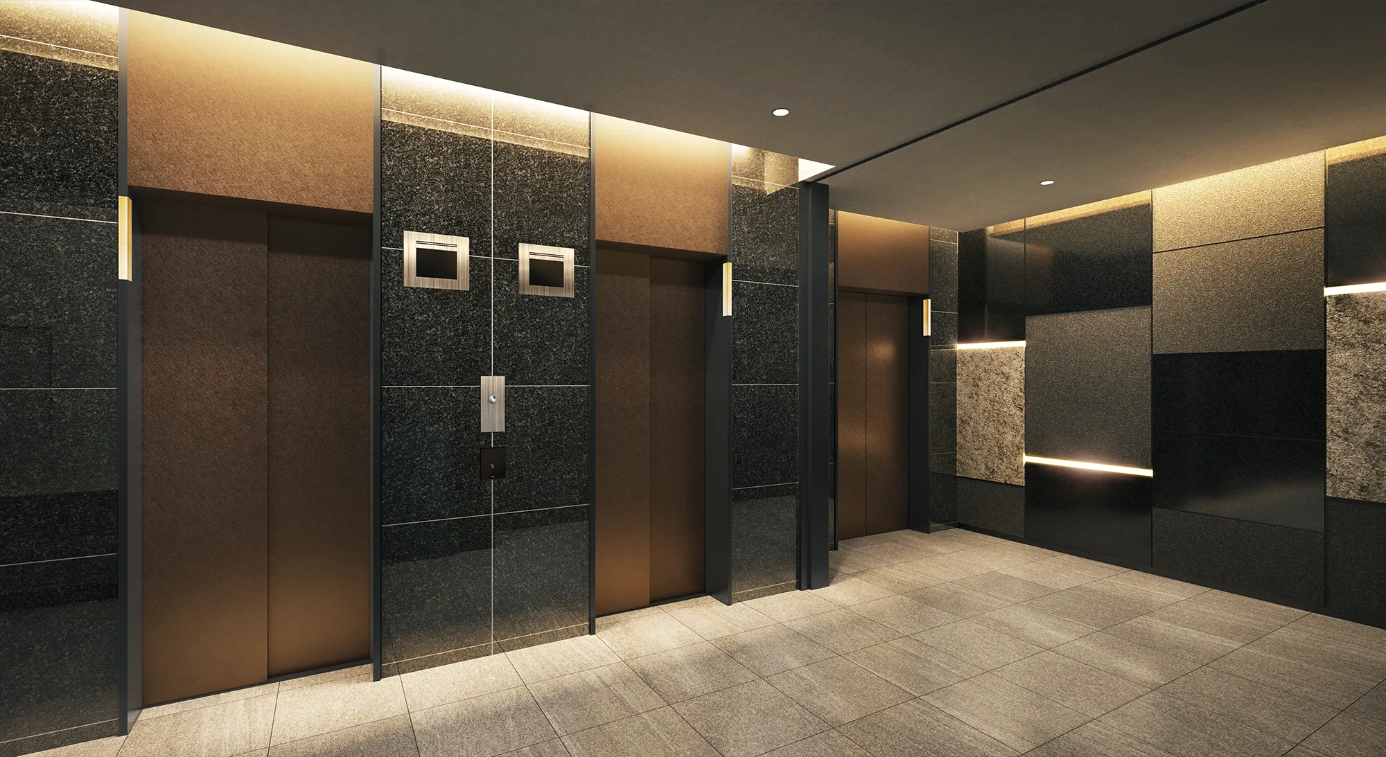 素材感とライティングが表情を演出するエレベーターホール。