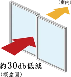 ※建物の構造によって遮音効果は異なります。※防音サッシの性能を表したもので、サッシにより音が平均約30db(500Hz以上の場合)軽減される製品を採用していることを表しております。※遮音等級についてはメーカー公表のものであり、実際の建物においては通気口・その他の開口部があるため、住戸における遮音性能は劣ります。