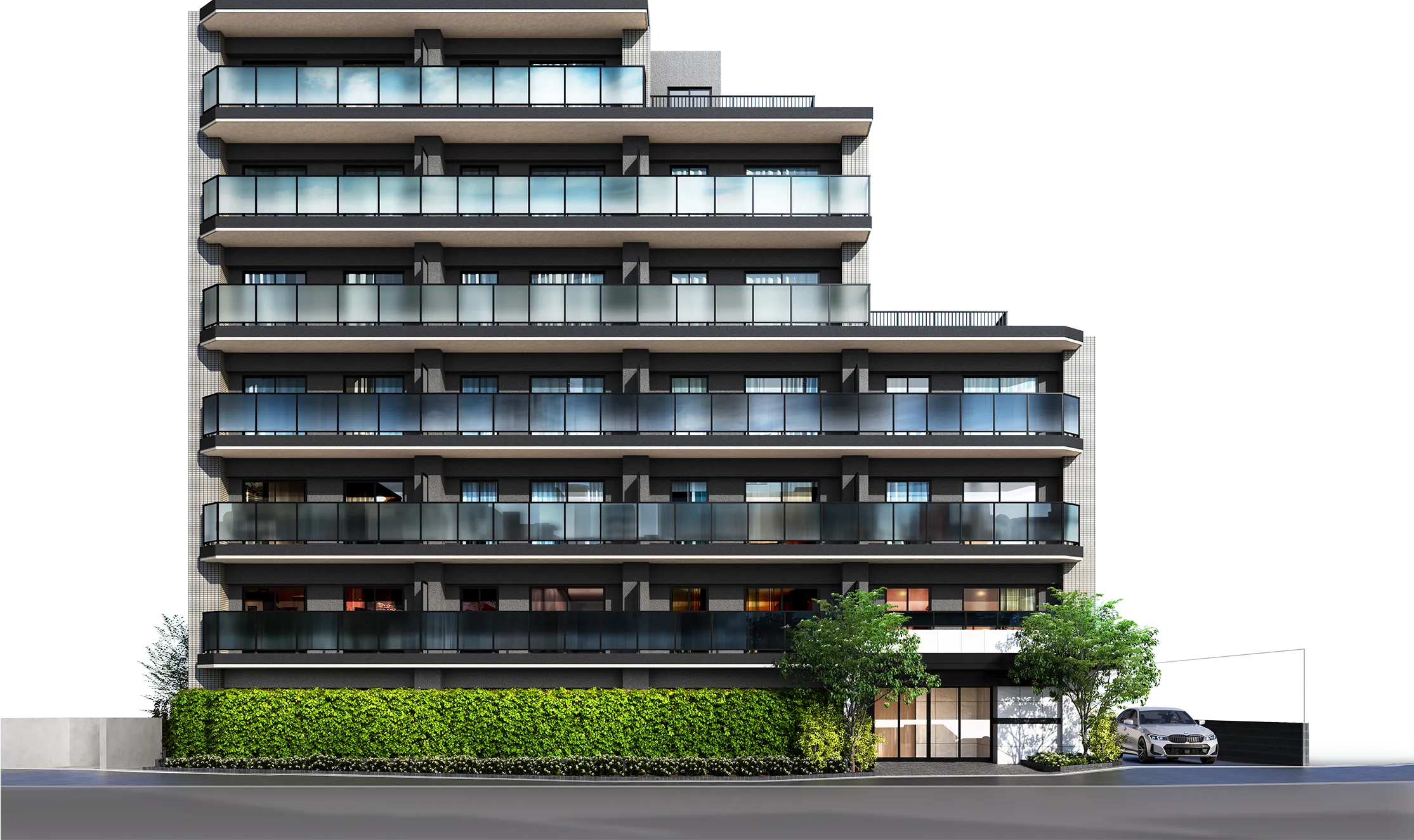埼大通り・与野中央通りから奥に入った第一種中高層住居専用地域に佇む地上7階建て。