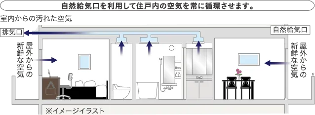24時間換気機能付の浴室暖房換気乾燥機を採用。住戸内の各所にある給気口から常時低風量で外気を循環。室内に空気の流れをつくり、室内環境を快適に保ちます。