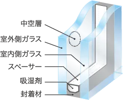 2枚のガラスの間に空気層を設けた複層ガラスを採用。高い断熱性を発揮し省エネにも貢献します。