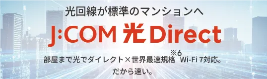 光インターネットサービス「J:COM光 Direct」を全戸に標準装備。ご入居されたその日から有線接続&Wi-Fi7による快適環境を完備。標準での1Gbps(※8)の高速通信に加え、ライフスタイルに合わせて10Gbps(※9)へのアップグレードも可能。