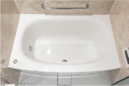 手前側のフランジ(上縁面)を広くフラットにとることで、腰掛けながら安定した姿勢で出入りが可能。斜めに傾斜したエプロンは浴槽をゆったり広く、同時に洗い場も広くなり理想的です。