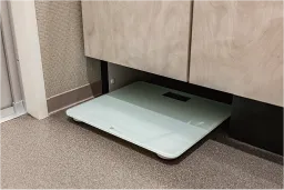 洗面化粧台の下部スペースを有効利用してヘルスメーター置場に。すっきり収納できます。