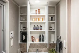 小物類から化粧品のストックまですっきり片付く収納スペースを確保しました。