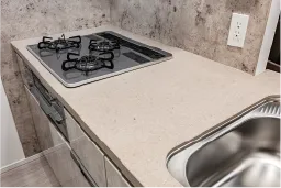 柔らかな素材感をもち、熱や衝撃に強いアクリル樹脂を主成分としたハイグレードな天板です。