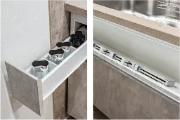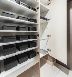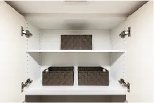 勢いよく閉めても、直前にスピードをゆるめ、ゆっくりと静かに閉まります。スライド式で、奥のものも取り出しやすく、大鍋などの収納に重宝します。