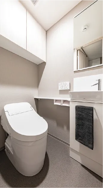 トイレットペーパーや小物などの収納に便利な吊戸棚を設けました。