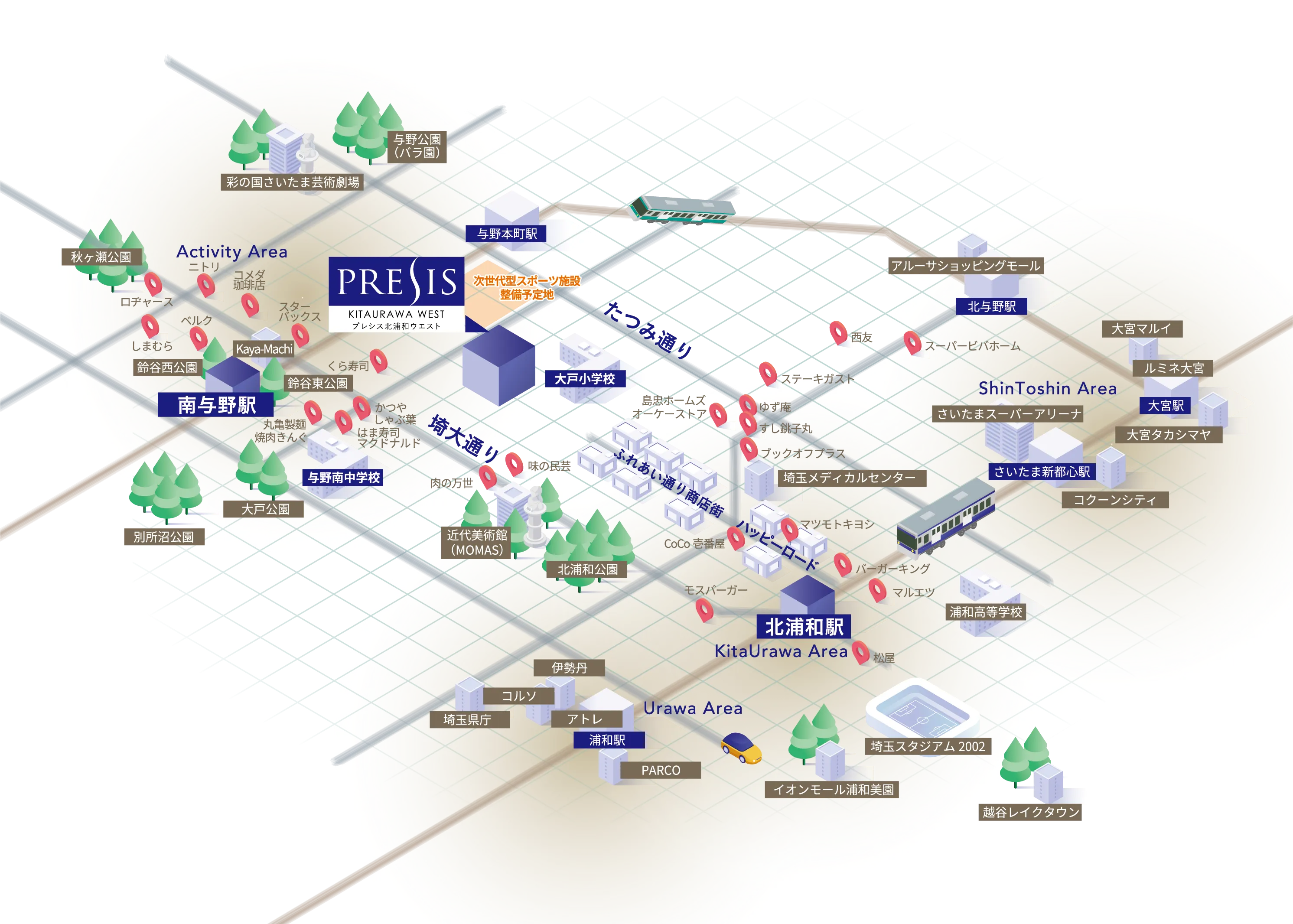 駅の西口側に「さいたまスーパーアリーナ(約3,000m)」、東口側に「コクーンシティ(約3,520m)」が広がる「さいたま新都心」エリア。音楽やスポーツのイベントに、ショッピングに。新しい出会いと感動が待っています。