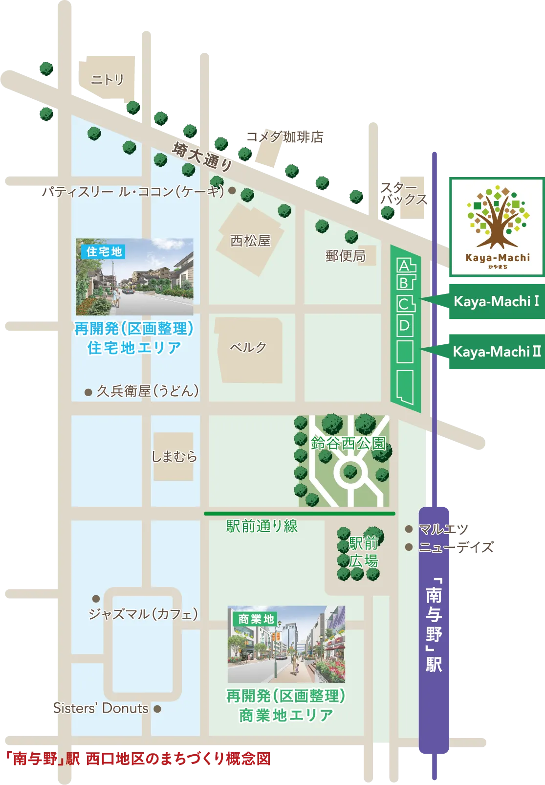 JR「南与野」駅の線路沿いに誕生した「Kaya-Machi」。緑としゃれた雰囲気に彩られた遊歩道のような“みち”に様々なお店が並ぶマーケットです。2期エリアも開業し、お店が増えて、さらに便利に、楽しく。