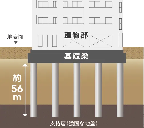 当建物は支持層に到達するように、約56mのコンクリート既製杭を打設。耐力・耐震性の高い堅牢な基礎を構築しています。