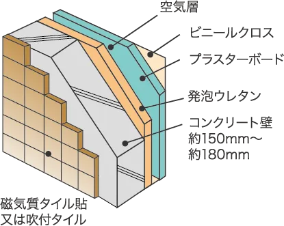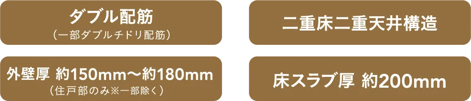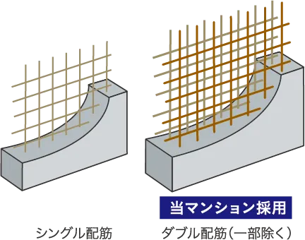 床スラブや妻壁、戸境壁は、コンクリート内に鉄筋を二重に組み上げるダブル配筋とし、高い構造強度を発揮しました。床スラブ厚は約200mmを確保。外壁のコンクリート厚を約150mm〜約180mm(住戸部のみ※一部除く)確保し、耐久性・断熱性を向上。