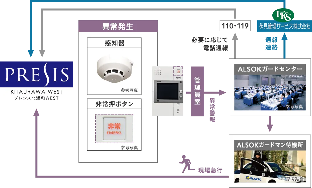 住戸内で火災などの異常が発生した場合、住戸内のセキュリティインターホンが警報音を鳴らし、警報表示が点滅、さらに管理室にも警報が届きます。同時にALSOKへ自動通報され、迅速かつ的確に対処。状況に応じて関係各所に通報します。