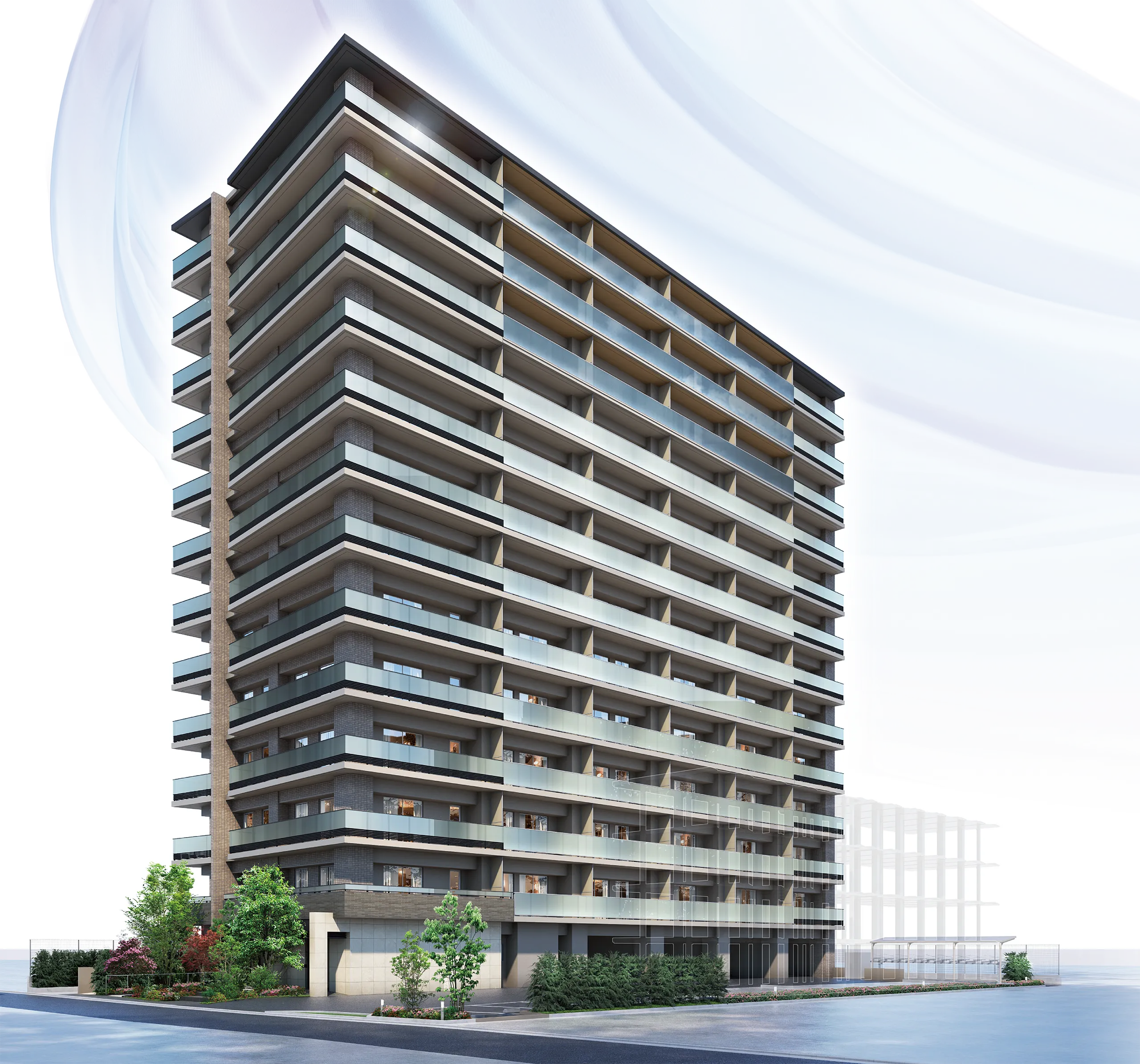 - ※掲載の外観完成予想図CGは図面を基に描きおこしたもので、実際とは異なります。なお、植栽は特定の季節の状況を示すものではありません。又、敷地内の植栽の樹種、大きさについては未確定となっており、竣工時には、完成予想図CG程度には成長しておりません。周辺の建物は省略しております。機械式駐車場は白線で表現しております。