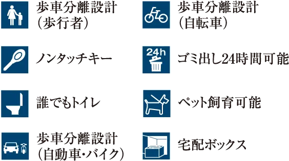 敷地にゆったりと住棟を配置。また、歩行者専用でエントランスの通路とマンション出入口、さらに、バイク置場・駐車場出入口の3箇所で歩車分離を実現しています。