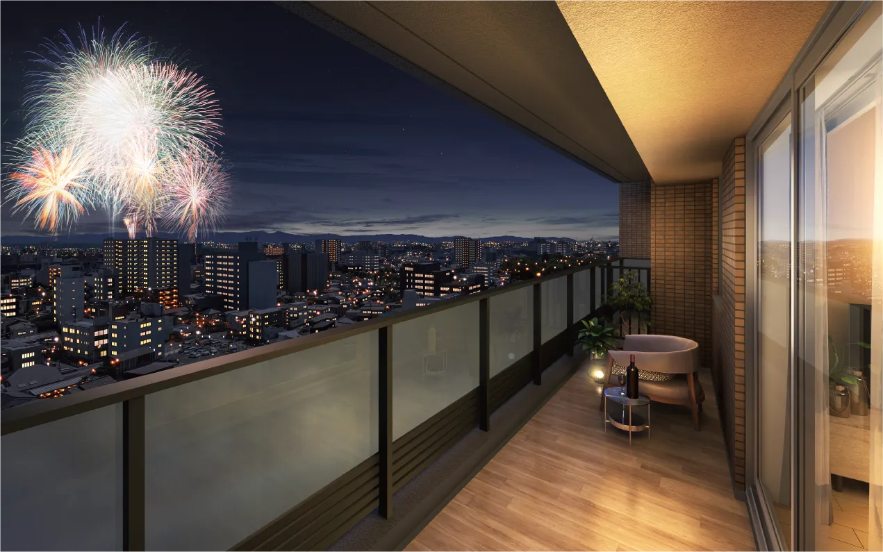 - ※掲載のバルコニー(Aタイプ)完成予想CGは計画段階の図面を基に描き起こしたものに、現地13階相当(高さ約36.6m)の地点より西方向を撮影(2025年6月)した写真を合成(一部CG処理)したもので、実際とは異なります。予めご了承ください。当該眺望は将来にわたって保証されるものではありません。また、掲載の花火イメージは熊谷花火大会の花火イメージをCG加工したもので、実際の見え方とは異なります。打ち上げ場所や開催は予告なく変更される場合がございます。