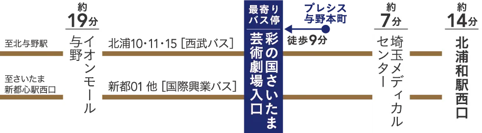 徒歩9分の「彩の国さいたま芸術劇場」バス停(約710m)からは「北浦和駅西口」「さいたま新都心駅西口」に行く便が運行しており、「イオンモール与野」などへお出かけの際にも活用できます。