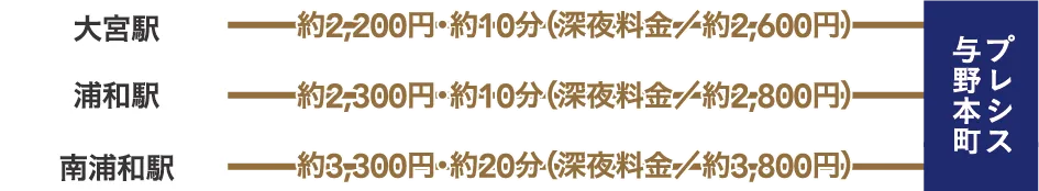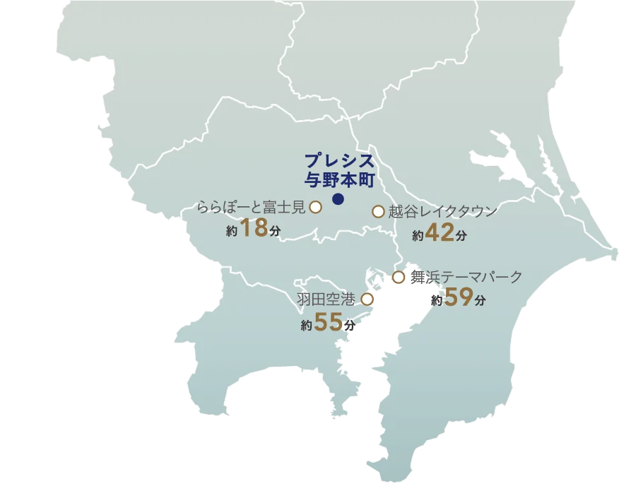 【各地への所要時間・利用路線】■ららぽーと富士見/浦和所沢バイパス、埼大前、下大久保、上宗岡2丁目、下南畑利用(約9km)■越谷レイクタウン/与野ランプ、浦和北ランプ、美女木JCT、草加IC利用(約33km)■羽田空港/与野ランプ、浦和北ランプ、美女木JCT、飯田橋ランプ、竹橋JCT、銀座ランプ、浜崎橋JCT、羽田出入口利用(約51km)。■舞浜テーマパーク/与野ランプ、浦和北ランプ、美女木JCT、飯田橋ランプ、竹橋JCT、神田橋ランプ、江戸橋JCT、木場ランプ、辰巳JCT、 葛西ランプ、舞浜利用(約49km)