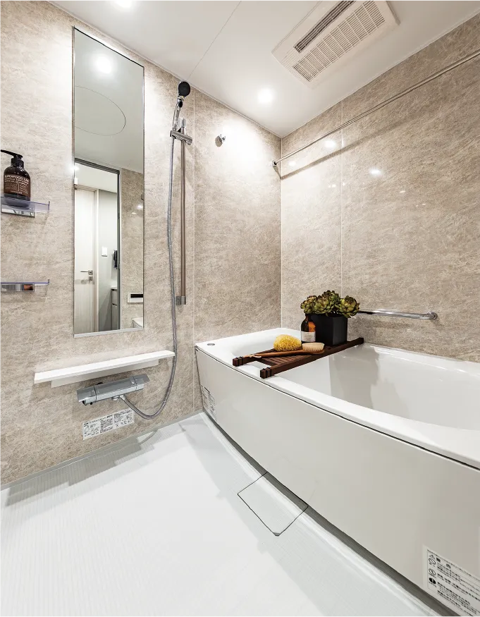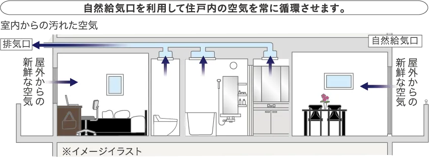 24時間換気機能付の浴室暖房換気乾燥機を採用。住戸内の各所にある給気口から常時低風量で外気を循環。室内に空気の流れをつくり、室内環境を快適に保ちます。
