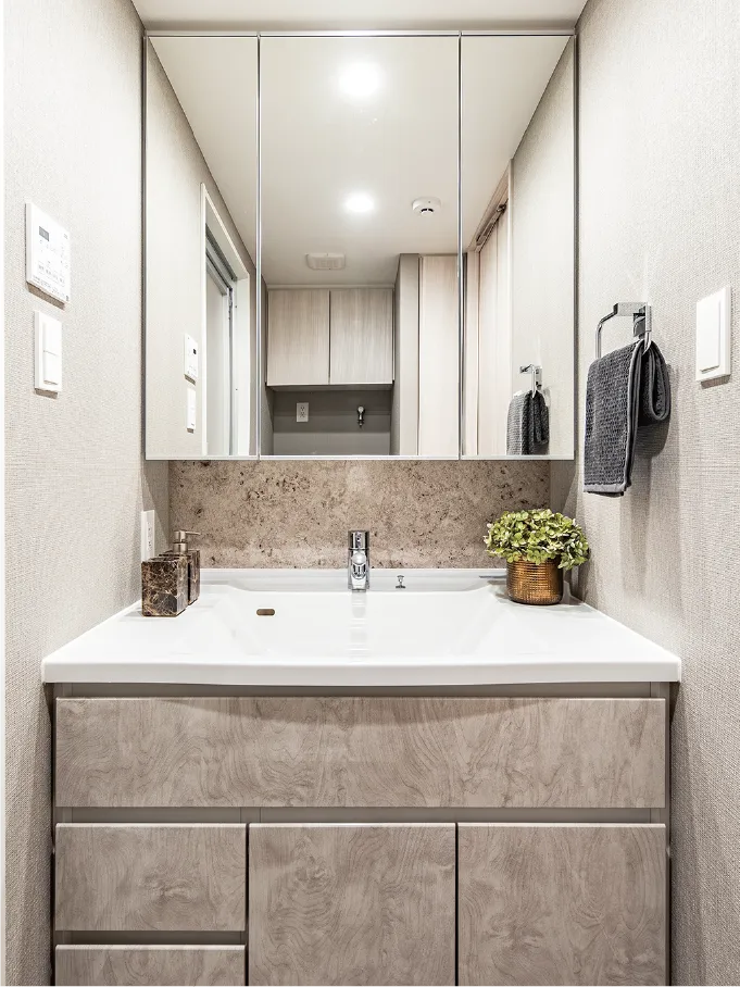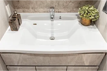 使い勝手の良い独立タイプの手洗いカウンター。カウンター部分は植栽なども飾れ、鏡付きなので身だしなみの確認もできます。