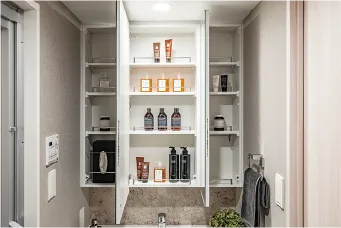 洗面化粧台の下部スペースを有効利用してヘルスメーター置場に。すっきり収納できます。