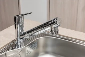 蛇口の先に浄水器を内蔵、ワンタッチで切り替えができます。また、浄水器ごとホースが引き出せます。
