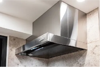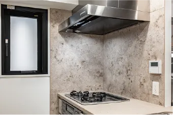 スタイリッシュな外観のスリム型レンジフードを採用。整流板の強力なパワーで煙を吸い出します。