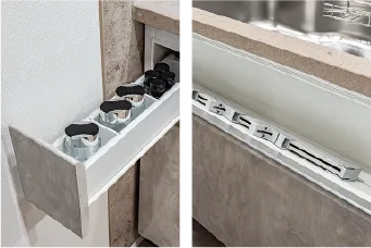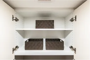 勢いよく閉めても、直前にスピードをゆるめ、ゆっくりと静かに閉まります。スライド式で、奥のものも取り出しやすく、大鍋などの収納に重宝します。