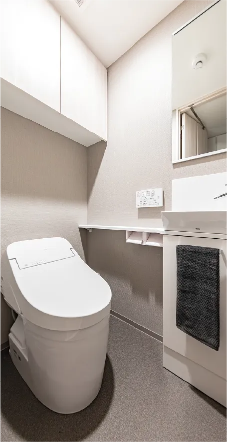 トイレットペーパーや小物などの収納に便利な吊戸棚を設けました。