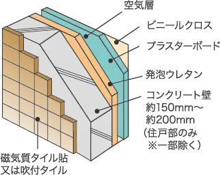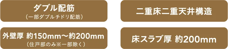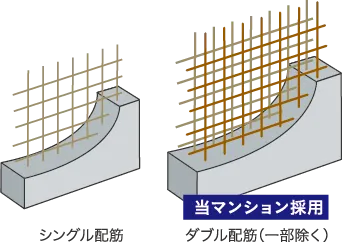 床スラブや妻壁、戸境壁は、コンクリート内に鉄筋を二重に組み上げるダブル配筋とし、高い構造強度を発揮しました。床スラブ厚は約200mmを確保。外壁のコンクリート厚を約150mm〜約200mm(住戸部のみ※一部除く)確保し、耐久性・断熱性を向上。