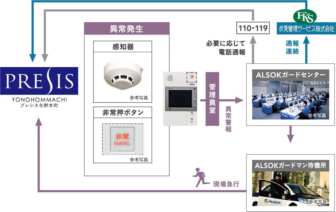 住戸内で火災などの異常が発生した場合、住戸内のセキュリティインターホンが警報音を鳴らし、警報表示が点滅、さらに管理員室にも警報が届きます。同時に綜合警備保障へ自動通報され、迅速かつ的確に対処。状況に応じて関係各所に通報します。