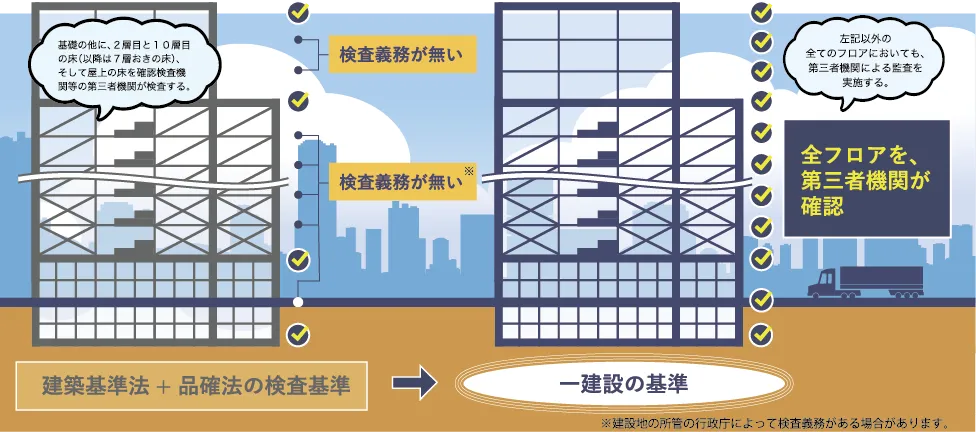 プレシスは、施工者・監理(設計)者による検査、建築基準法に基づく必須の検査に加えて、住宅性能評価と第三者機関による品質監査を独自に導入しています。