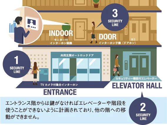 犯行の手口が多様化している昨今、セキュリティー体制は、住まいを選ぶうえで検討するべき最も大切な要素のひとつとなっています。真の「安全」「安心」を目指したトリプルセキュリティーが、皆様の暮らしを守ります。※2
