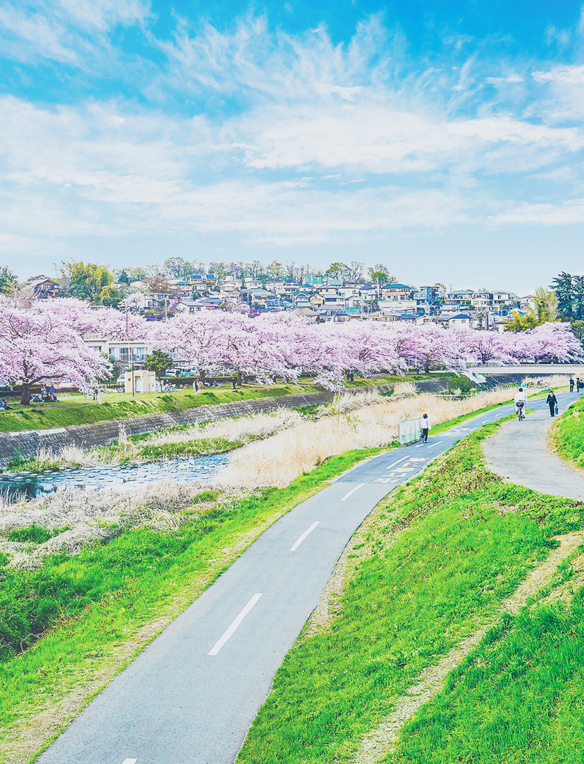浅川沿いに桜並木が続き、春には満開の桜、夏には新緑が楽しめます。